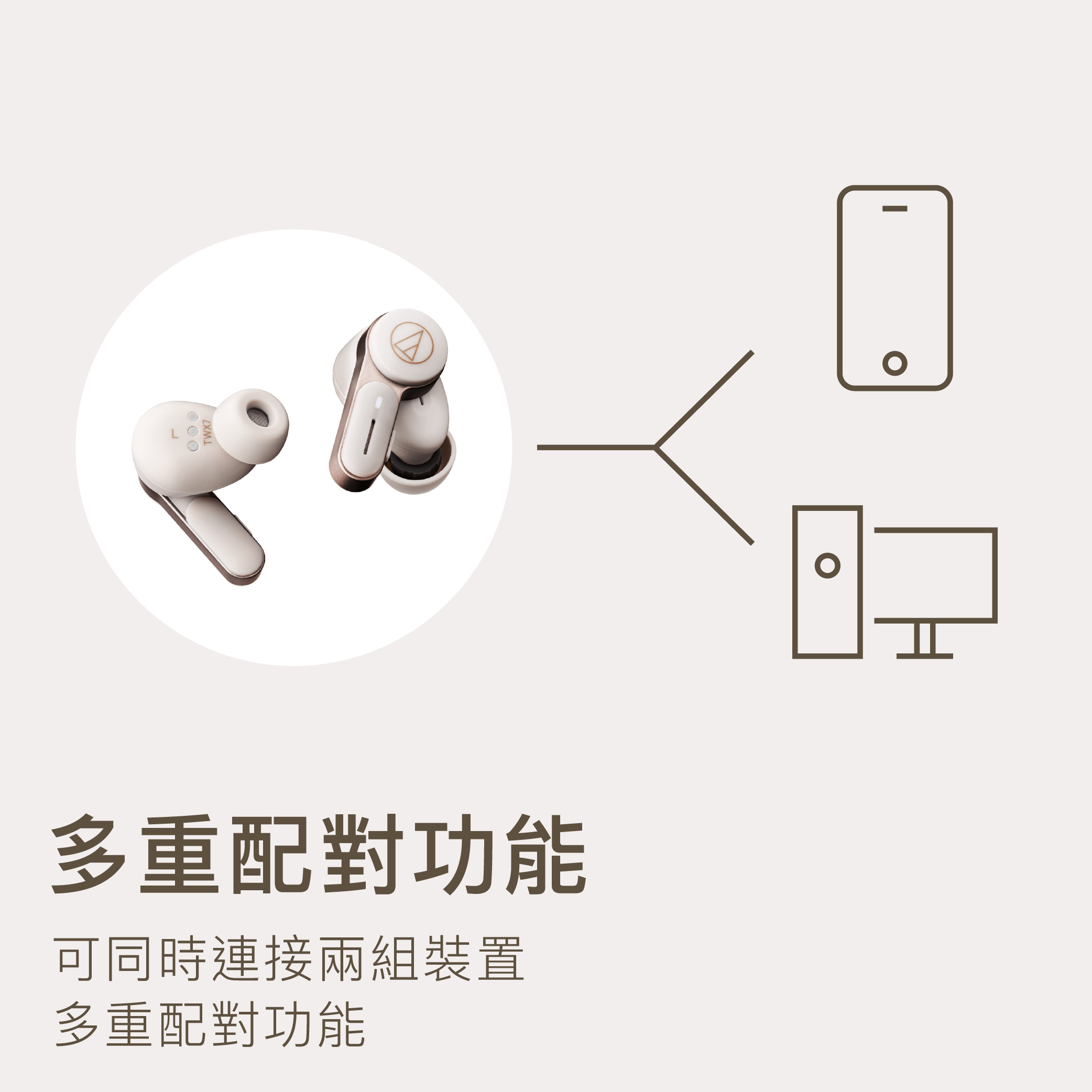 ATH-TWX7,具有能創造屬於自己寂靜空間的複合數位降噪技術;支援LDAC編碼,能以高解析度品質無線聆聽高品質聲音;沉穩和諧的色系設計;小耳朵也能佩戴,好握取攜帶外出的外形尺寸。從工作到居家時刻,享受每一刻與聲音相關的生活風景。