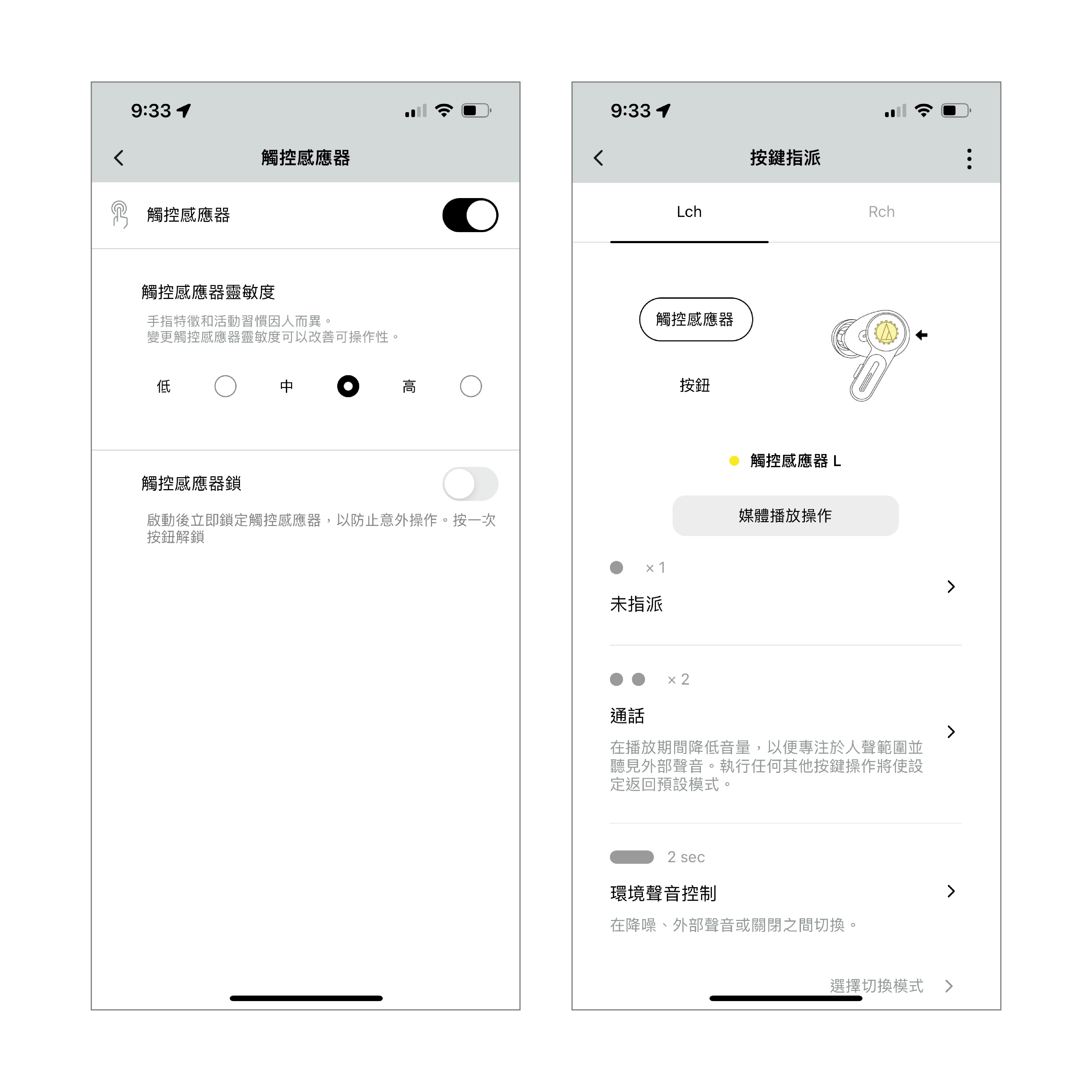 根據自己的需求,分配播放歌曲/音量調整/環境聲音控制等操作於觸控面板&按鍵操作。