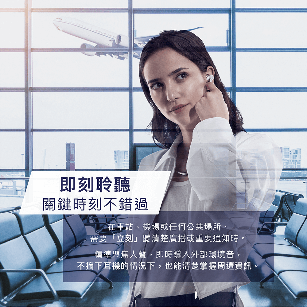 無論是在便利商店結帳時的短暫對話,或想即時聽清車站、機場等場所的廣播,此功能都能派上用場。只需單一操作,即可降低正在播放的音量*,同時聚焦於人聲頻段,主動擷取周遭的環境音。
