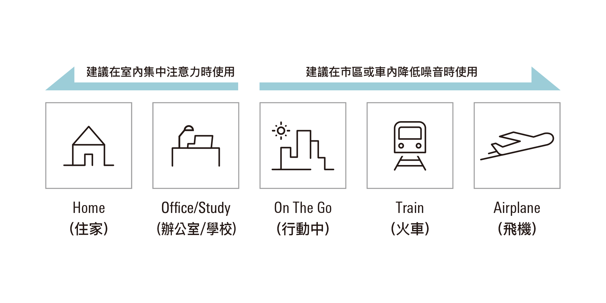 針對居家、辦公、通勤、搭乘交通工具等常見使用情境所對應的環境噪音,提供五種預設降噪模式選擇:Airplane(飛機)、On The Go(移動中)、Office/Study(辦公/學習)、Home(家庭)、Train(火車)。使用者可依使用情境,在鐵三角專用 App《Connect》中隨時選擇最合適的降噪模式。