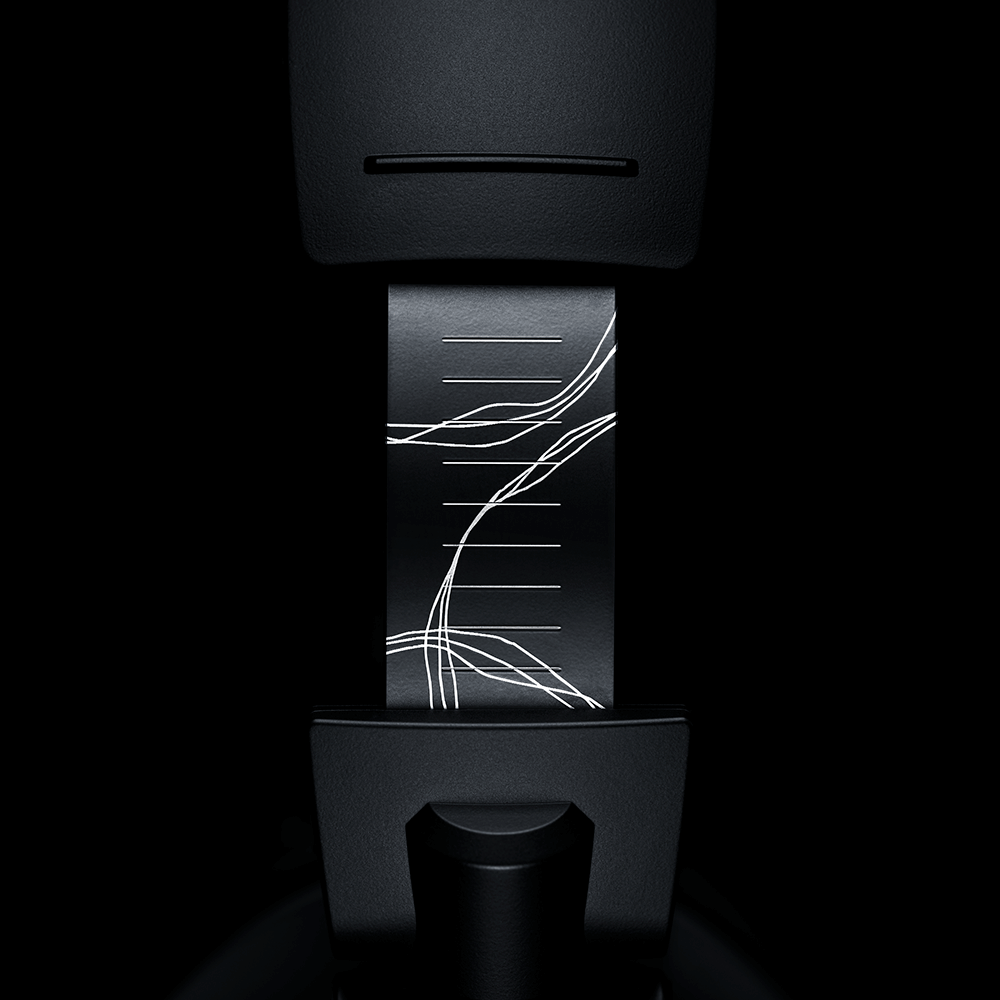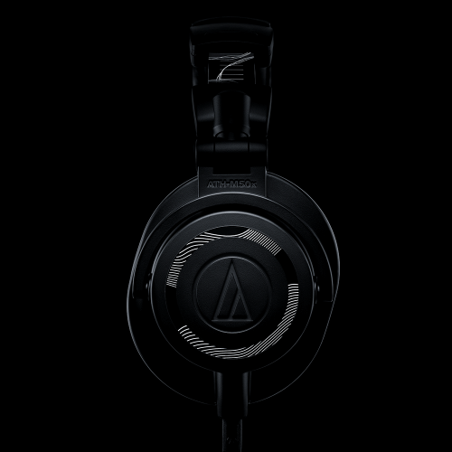 與現有的 ATH-M50x 不同,頭帶上的滑軌與金屬圓環部分,特別施以以墨繪筆觸與音波形狀為靈感的獨特雷射雕刻花紋,且兩處零件都統一以「黑色」來進行設計。