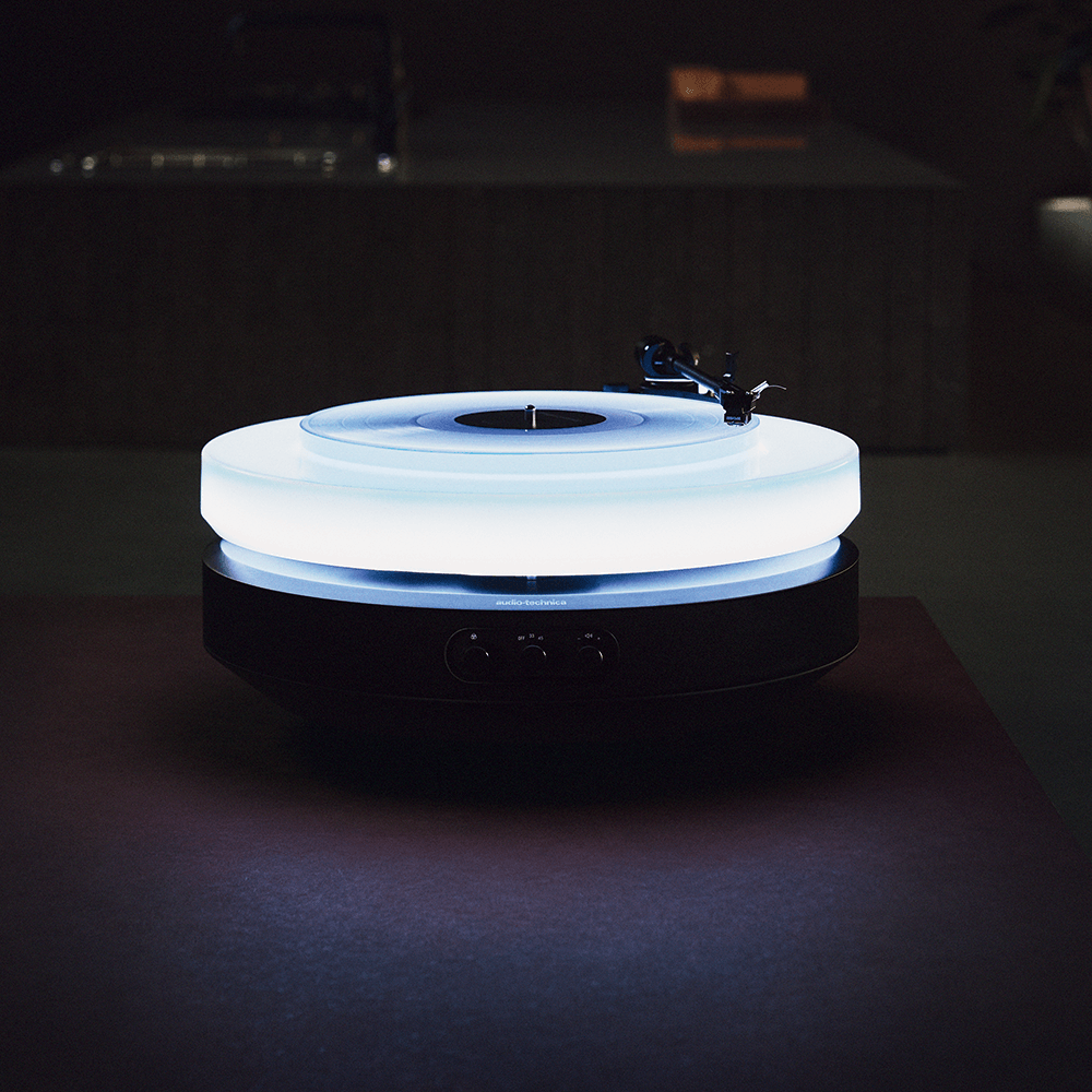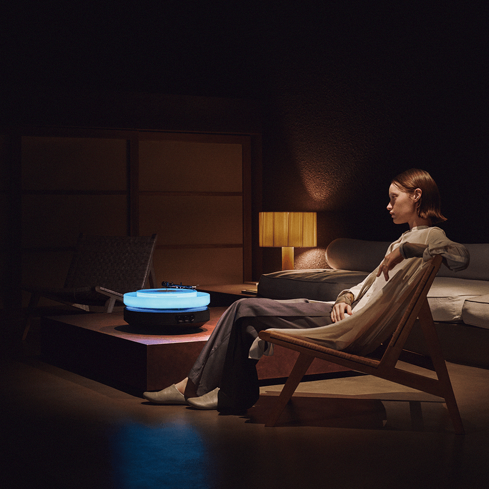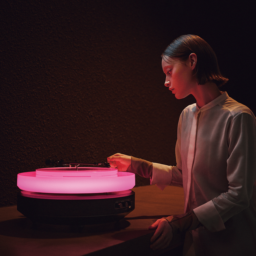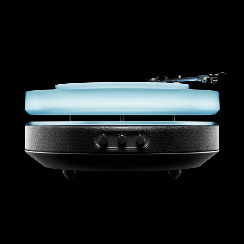 唱盤以彷彿懸浮於空中的設計,散發令人屏息的魅力,卻又巧妙地融入空間,醞釀出色彩與和諧。其充滿創造力的造型,將「音」與「光」融為一體,包覆整個空間,為感官帶來鮮明且深刻的衝擊。