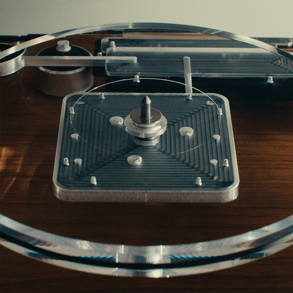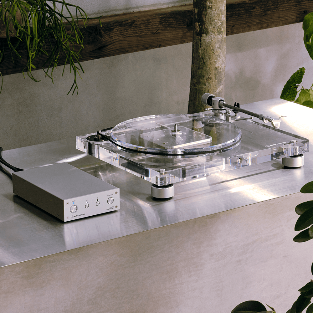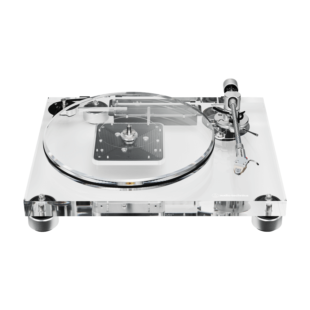 兼具透明設計美感與純淨無染音色的黑膠唱盤『AT-LPA2』。為了同時實現設計性與音質表現兩大要素,採用了極為理想的材料——壓克力。壓克力不僅能展現出晶瑩剔透的外觀美感,其共振頻率也與黑膠唱片本身相當接近,能有效抑制對音質清晰度造成影響的多餘共振。