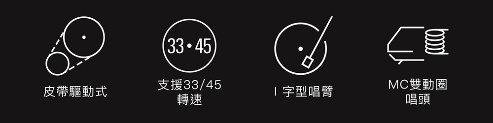 ▌支援 33/45 兩種轉速的皮帶驅動式黑膠唱盤